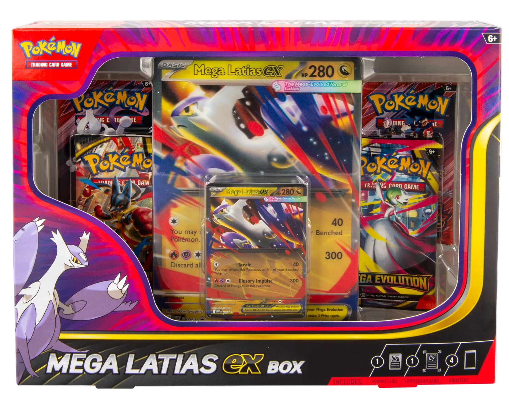 Mega Evolution takes the power of the Legendary Pokémon Latias past its limit! With awesome speed, it surges through the sky with draconic might. Now you can team up with Mega Latias ex as a playable foil promo card, plus an oversize lenticular card with amazing artwork. You also get four booster packs with even more Pokémon inside!